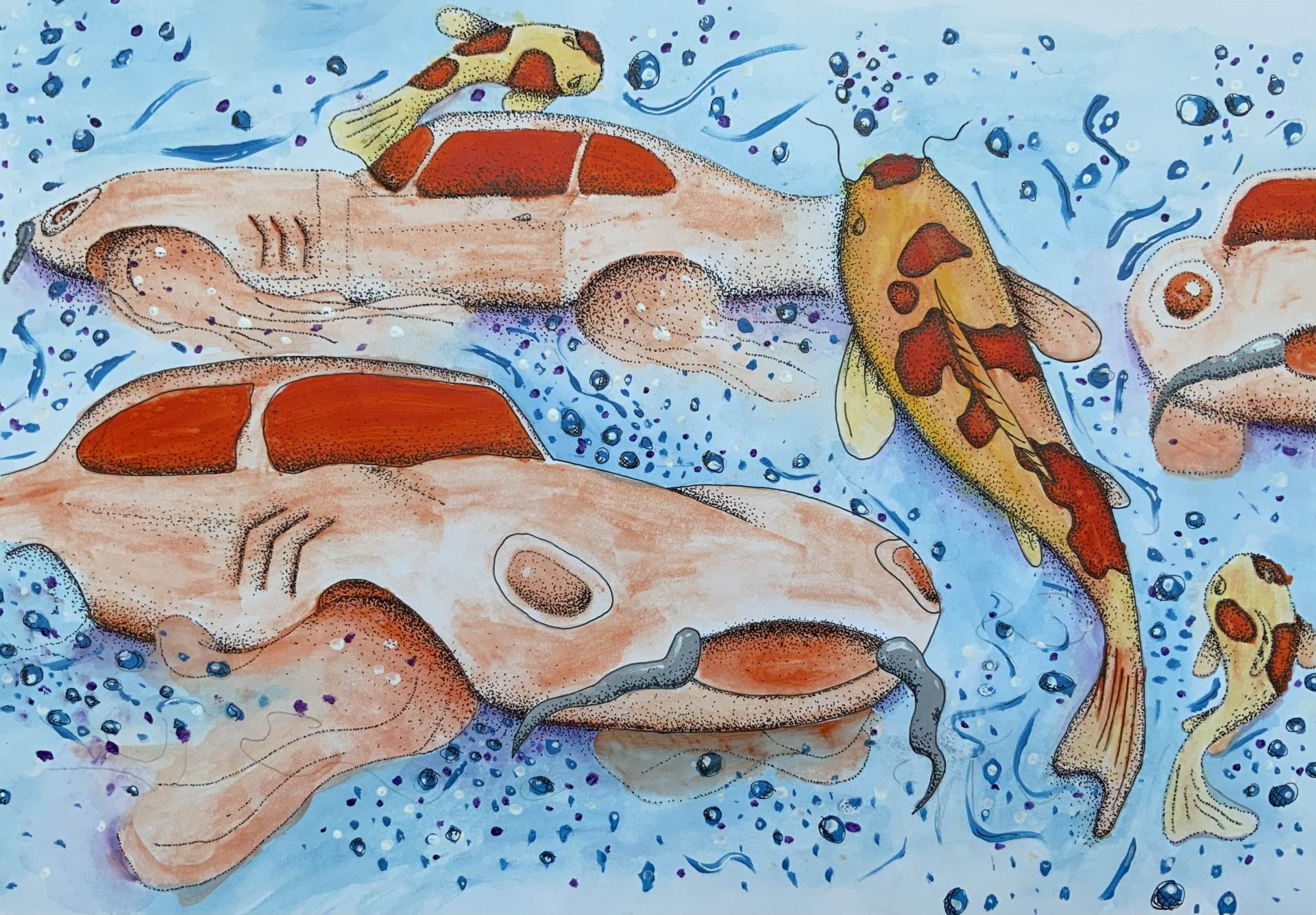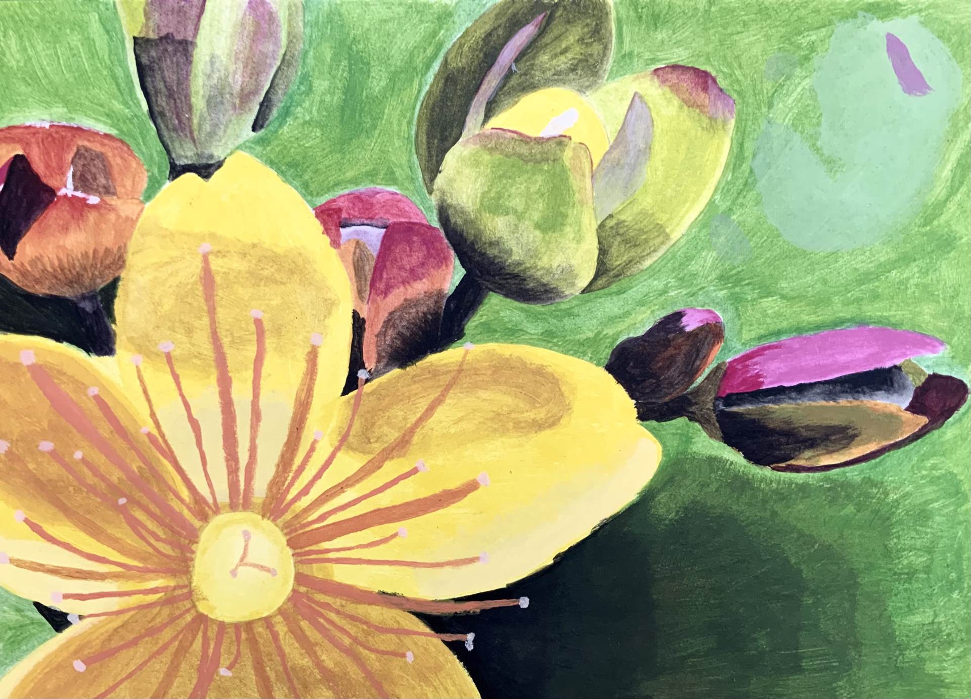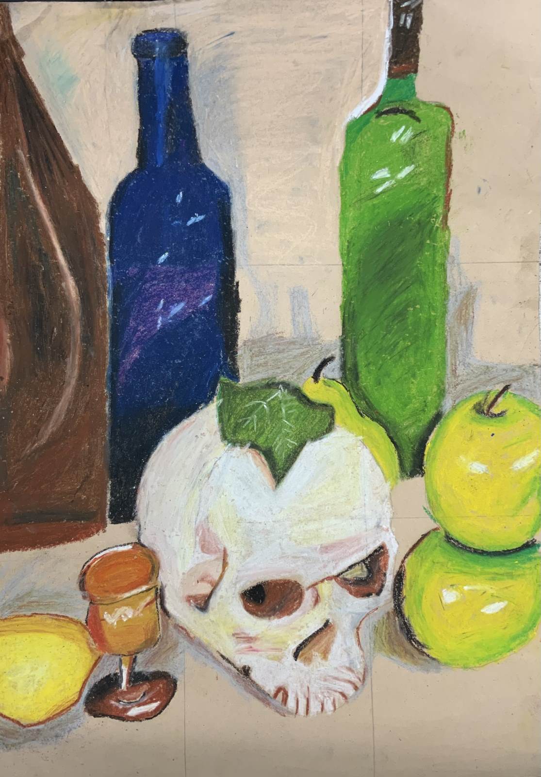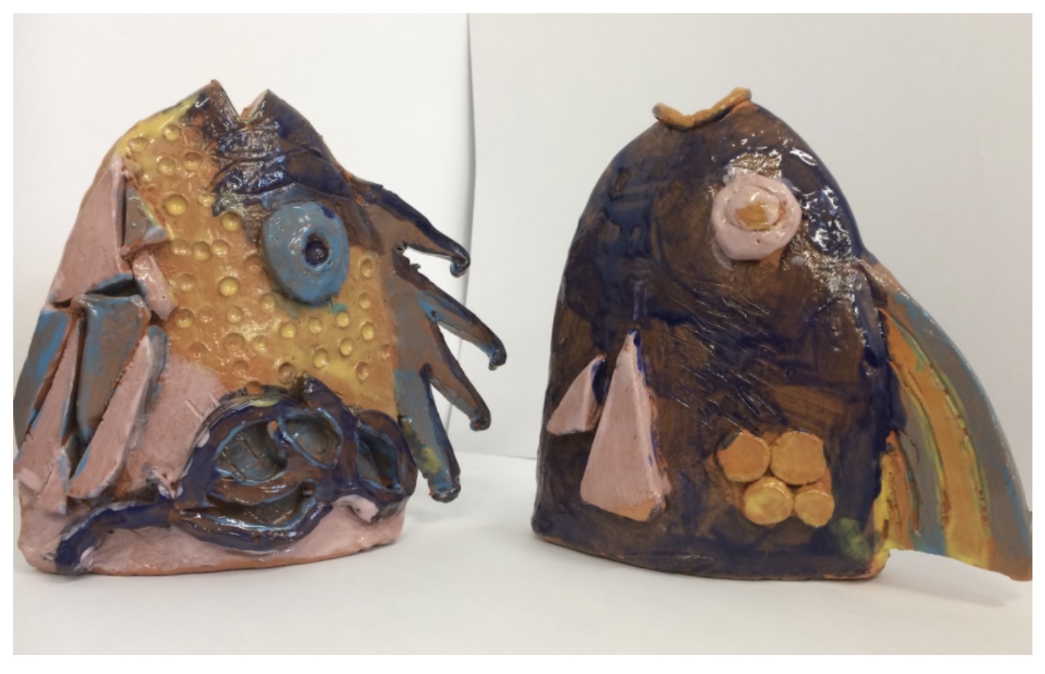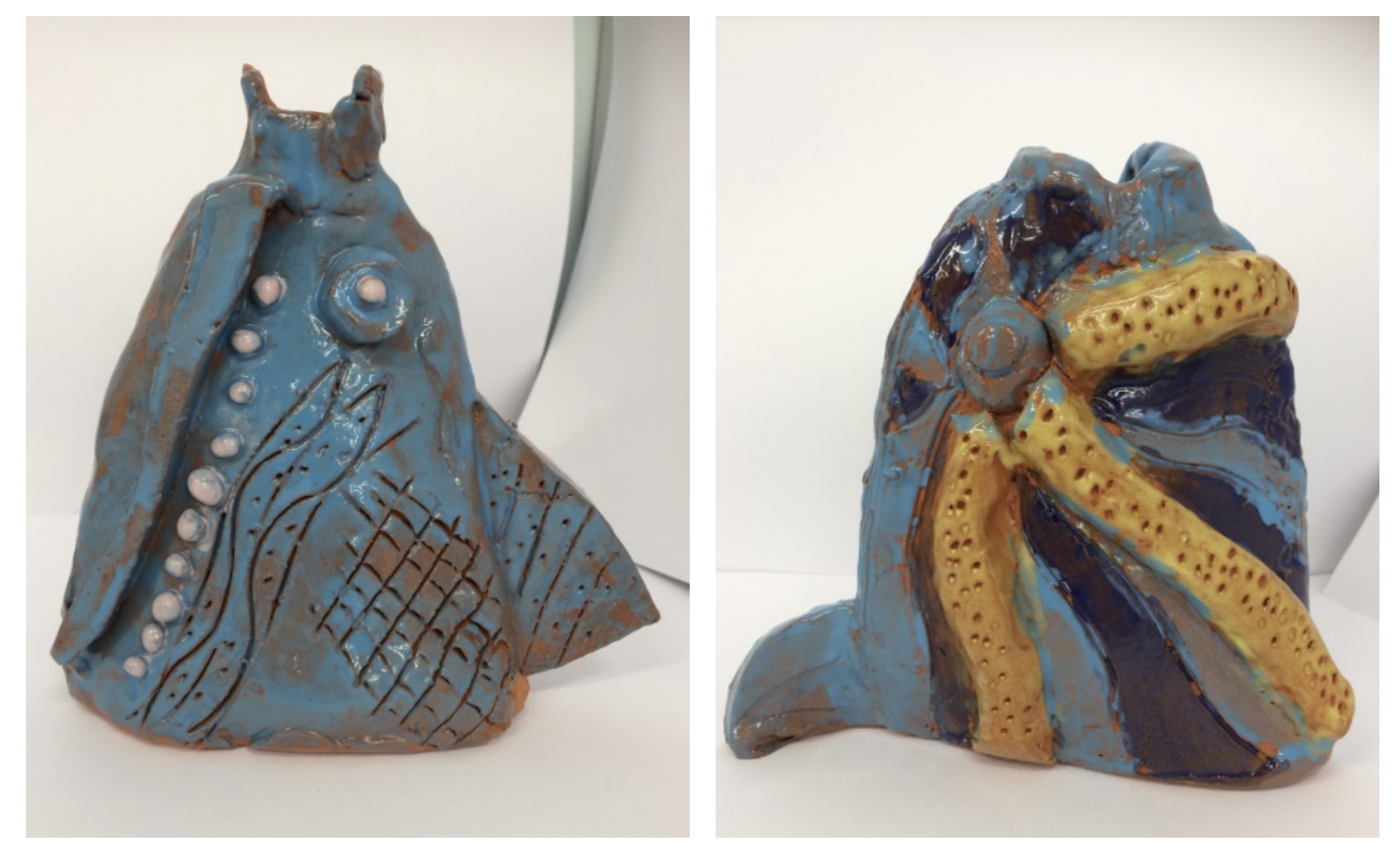 Year 7: Fish and biomorphic pots (drawing, watercolour, clay construction), Natural Form (pattern and painting), Still Life (photography and oil pastel)