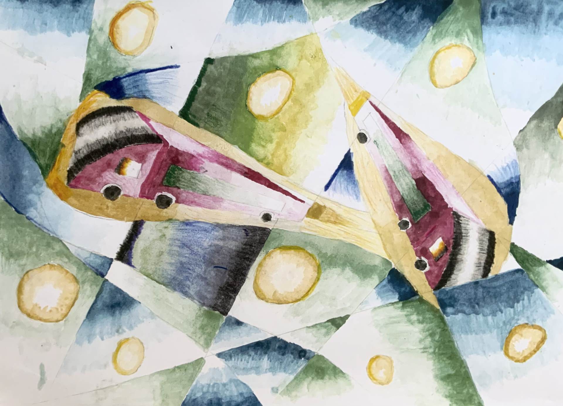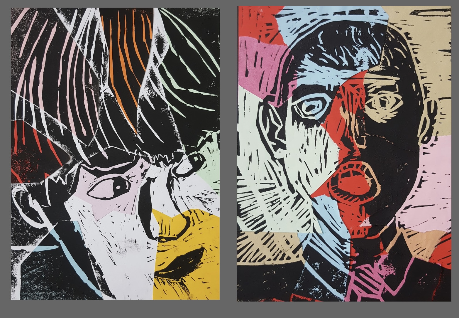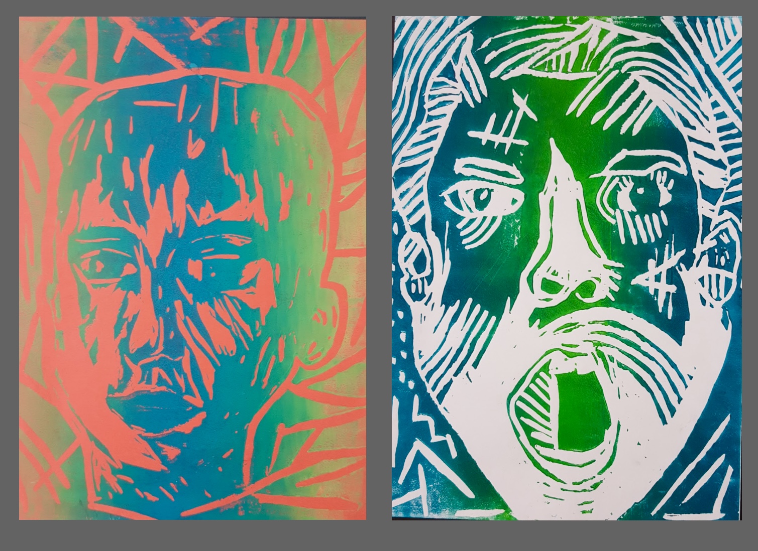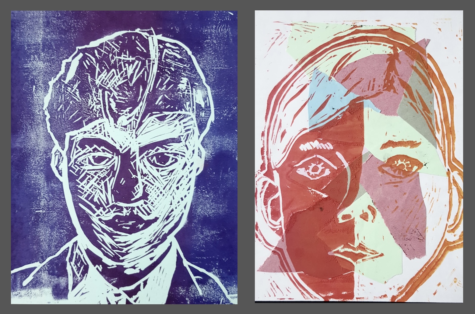 Year 8: Futurism and transport, (perspective, watercolour), Portraits (drawing, lino prints)