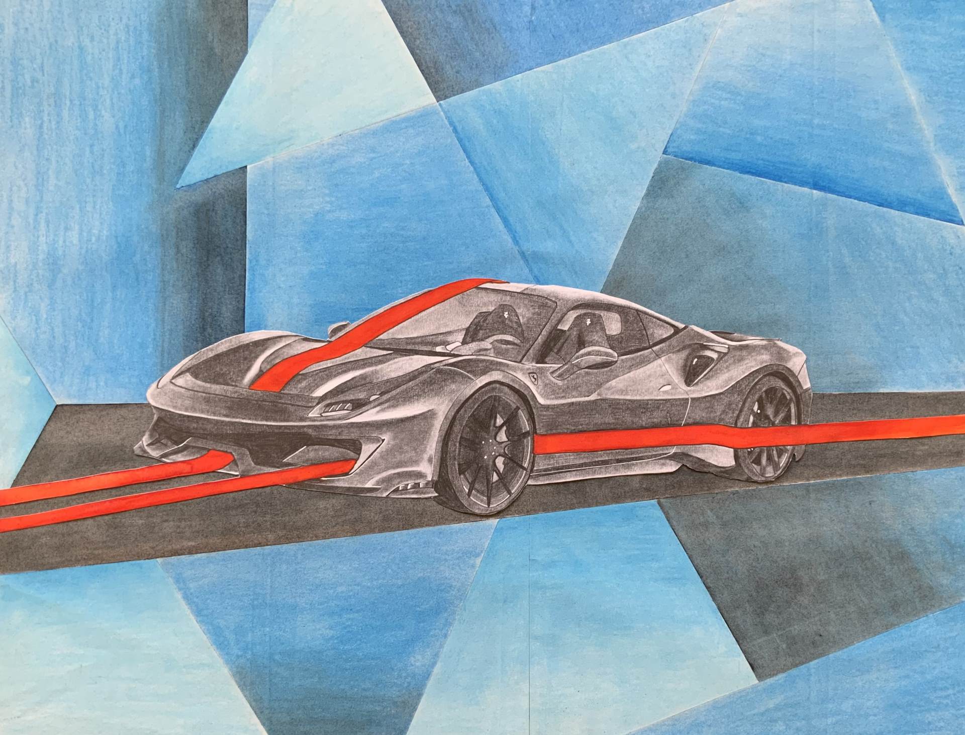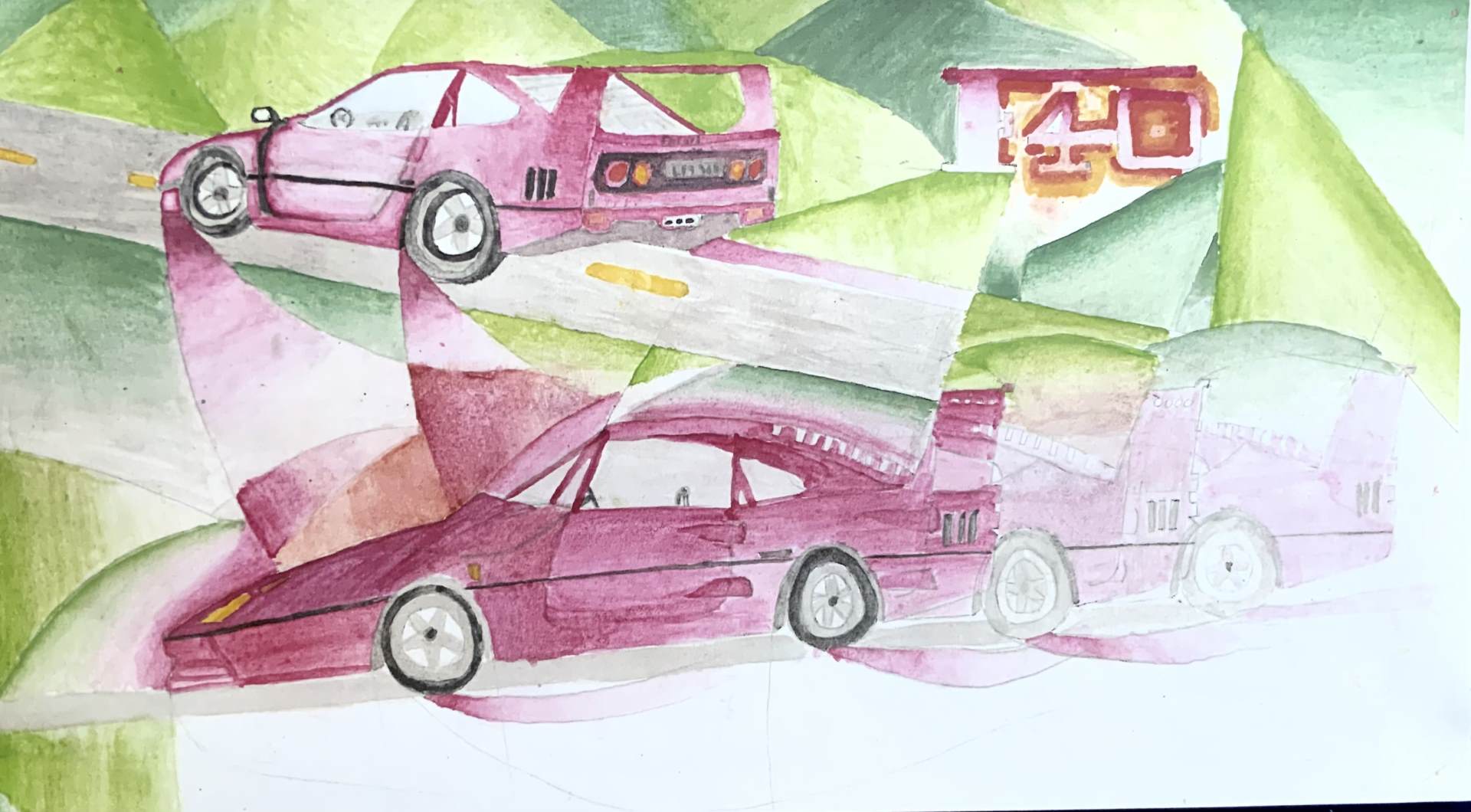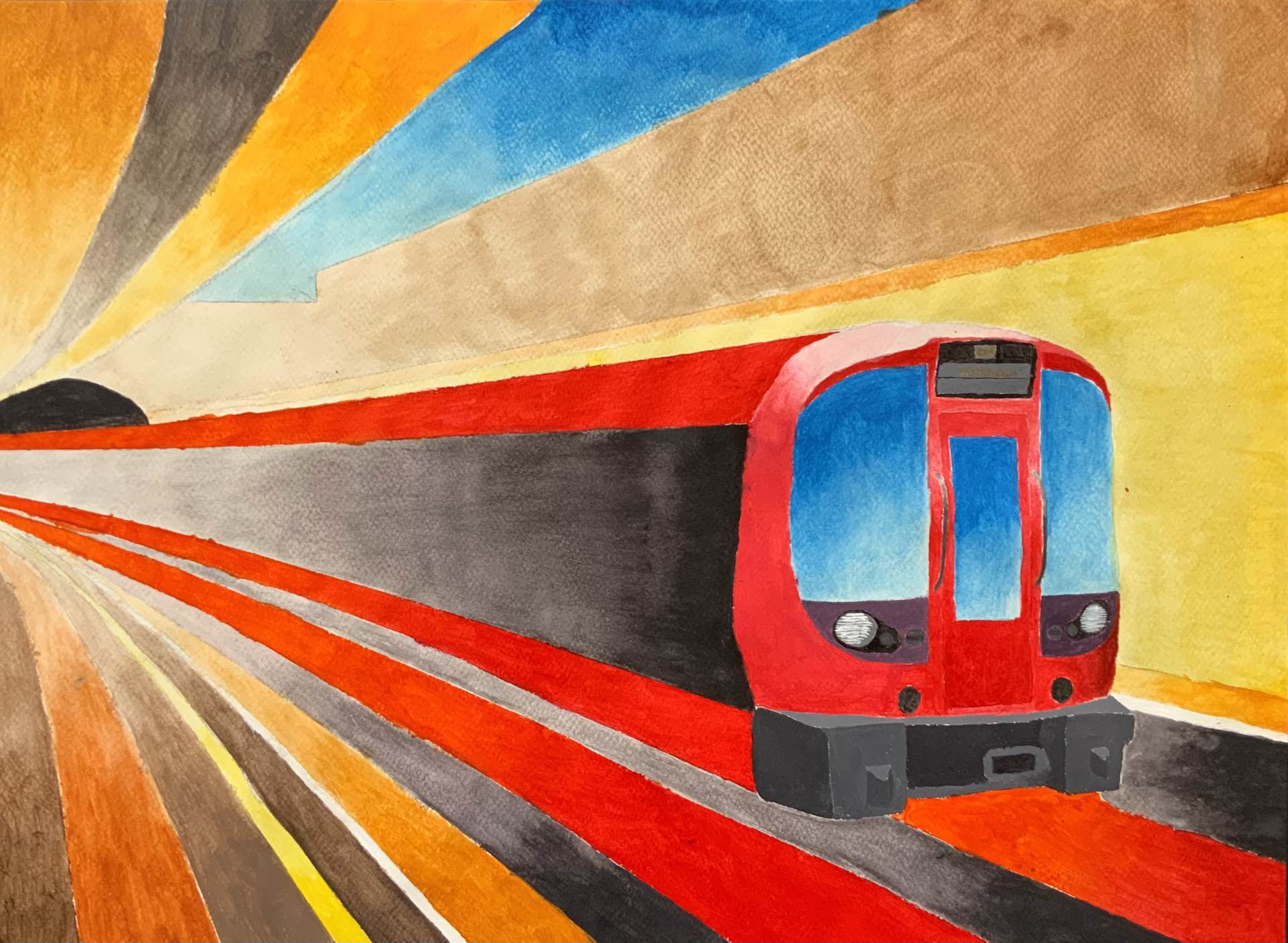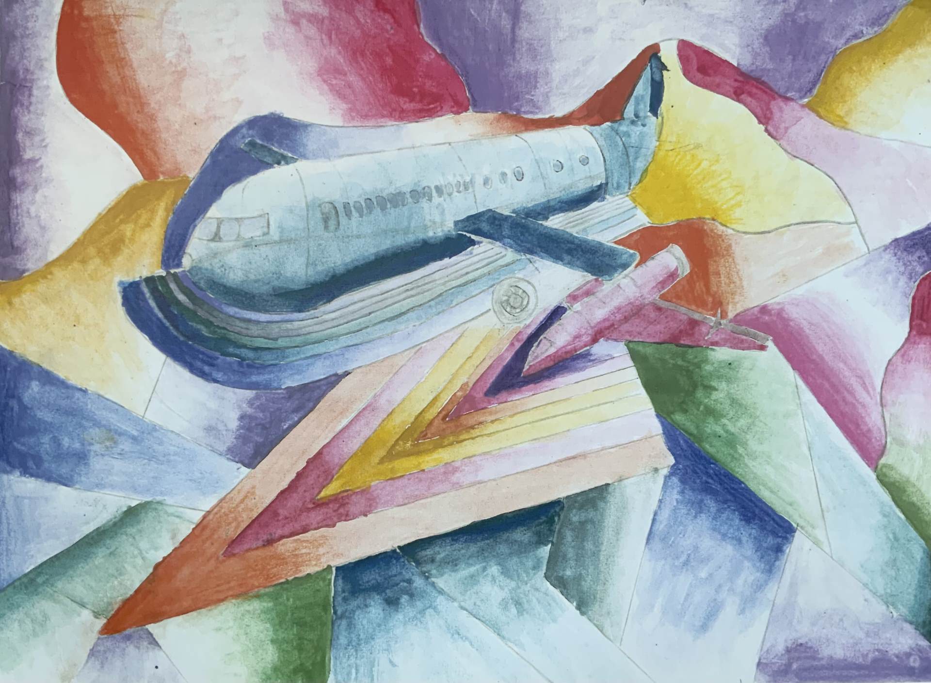 Year 8: Futurism and transport, (perspective, watercolour), Portraits (drawing, lino prints)